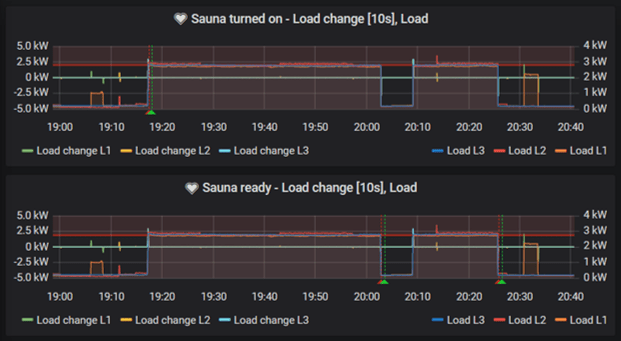 In case sauna is turned on intentionally, it would be nice to get another notification when it’s ready (hot enough). Easiest way to detect this would of course be to monitor the temperature. Sauna is however hot (we like it around 80° C) and this makes battery based temperature sensor not suitable for this task. So, I am trying to detect the same from the electricity usage. I know, the thermostat in the heater is also pretty near the floor and same could have been applied to another temperature sensor. I think my approach is more appropriate in context of this blog series.