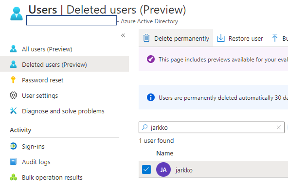 - … and when it didn’t help, maybe permanent deletion does? No luck with this one either. It is important to understand that the guest account in the inviting AzureAD is basically only a reference (actually it has some local attributes also) to another directory. No changes are written in any direction after accepting the invitation (at which time the user name etc. gets copied from invited directory). So changing or removing the guest account makes no difference to the other side. This is why my email address still has two accounts tied to it and the problem remains.