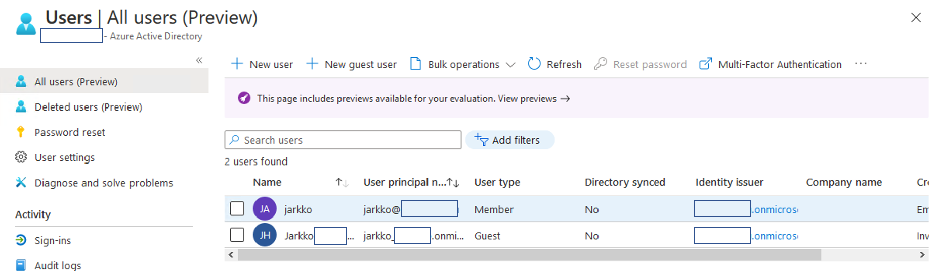 - Looking at the newly created AzureAD (created by the guest invitation) we can see that my account is still there. I actually logged in to the https://portal.azure.com portal with that account created in the step 4