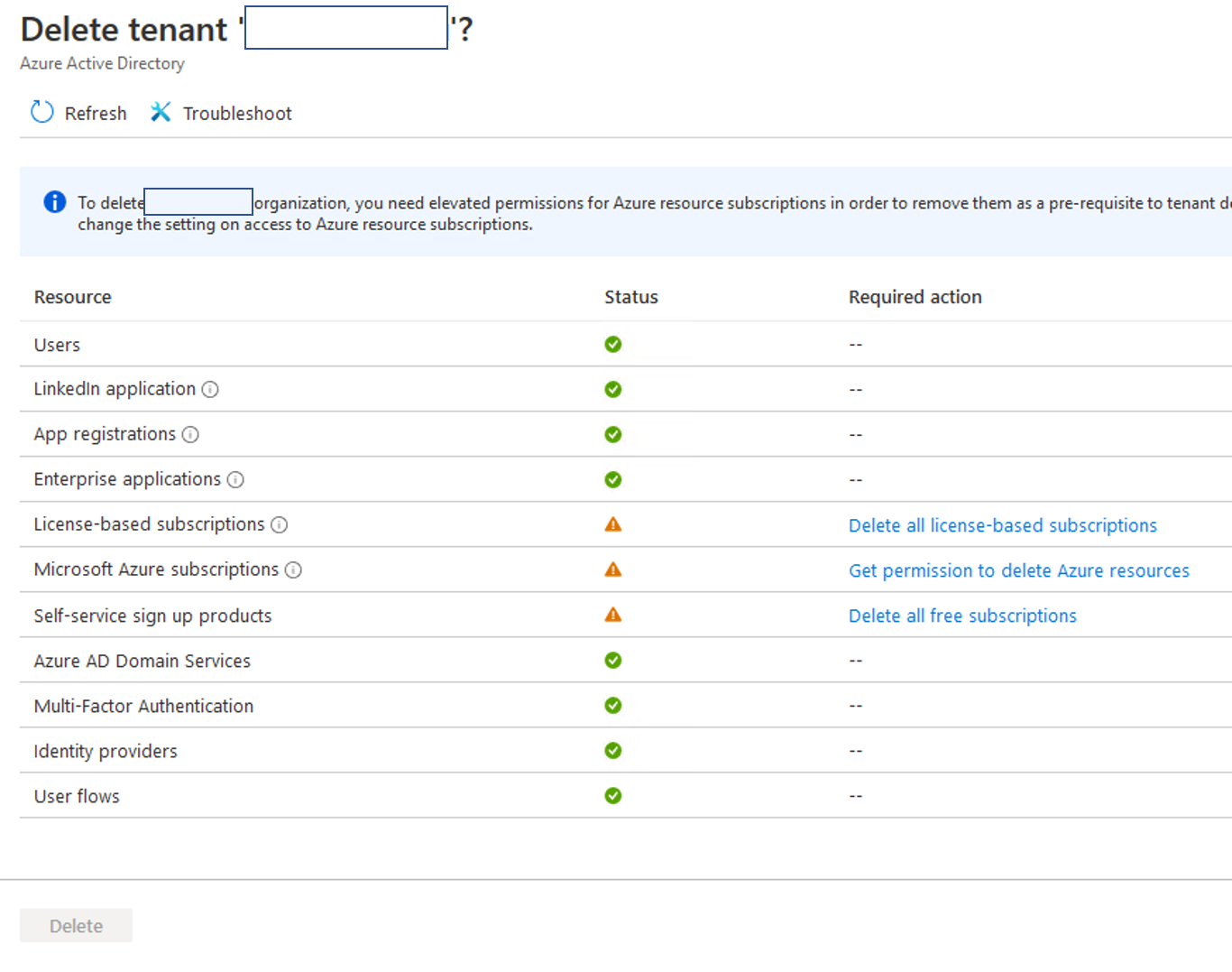 - Then we can return to AzureAD “Overview” and select “Delete tenant”