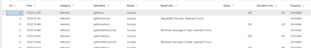 Power Apps monitor showing multiple pages of responses with “received 0 rows”. For my case this meant approximately 20 seconds added delay for the query, although the result remains the same.