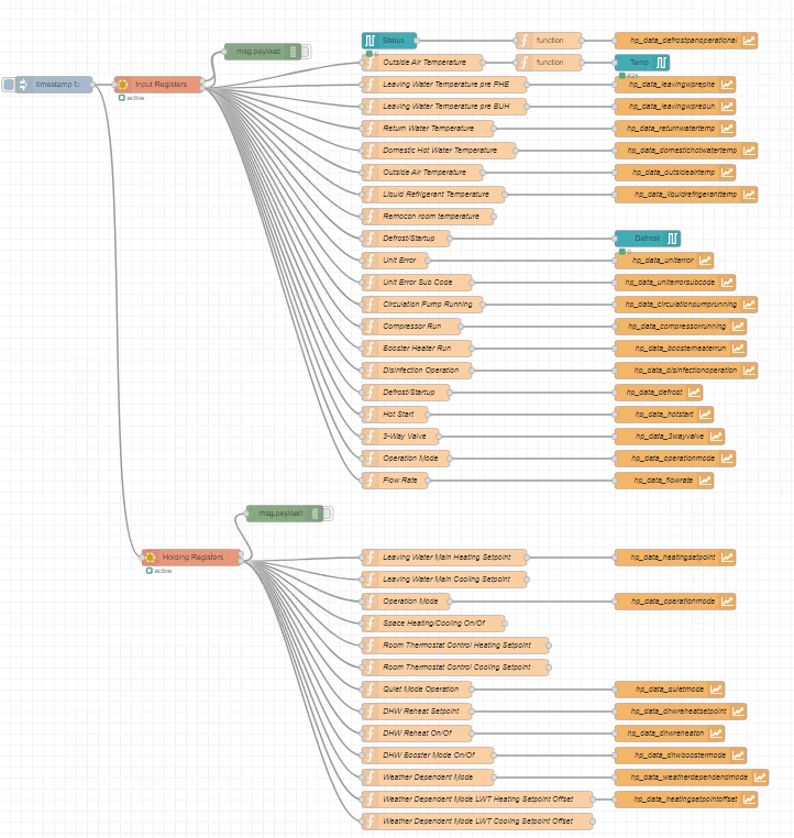 In the above Nodered flow values are read from the modbus registers every 5 seconds and the published for the Prometheus. As an example the input register for domestic hot water temperature is read with the following function.